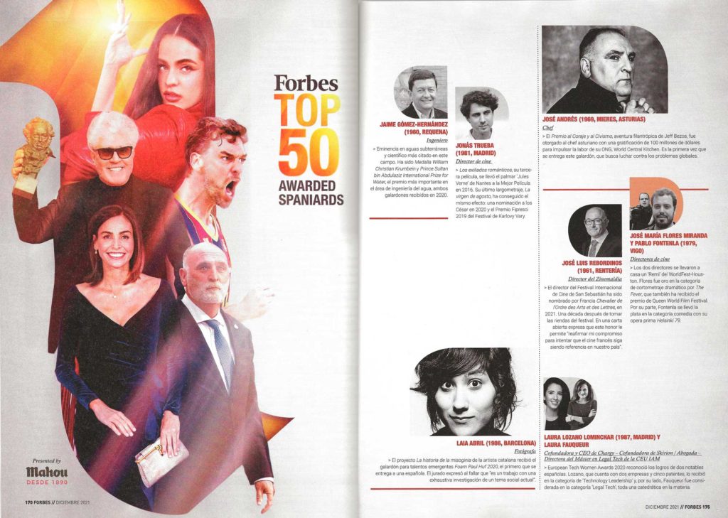 Perfiles de la talla de Alejandro Sanz, Rosalía, Fernando Alonso, Alexia Putellas, Marc Márquez, Carlos SainzFerran Adrià, Martín Berasategui, José AndrésAndrés VelencosoInés SastreManolo BlahnikPedro Almodóvar, Penélope Cruz, Antonio Banderas, entre otros, aparecen en esta lista TOP 50 de FORBES junto a nuestra querida cofundadora Laura Lozano. Todo un honor ver a nuestra cofundadora en esta lista rodeada de personalidades tan ilustres en cada uno de sus respectivos campos profesionales.